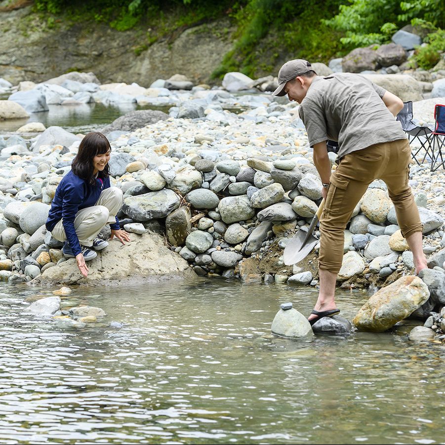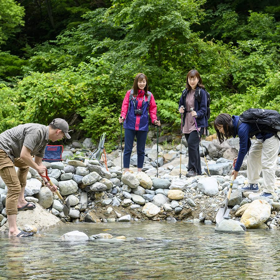 岩を動かし川の水を混ぜながら手作りの露天風呂をお楽しみください。